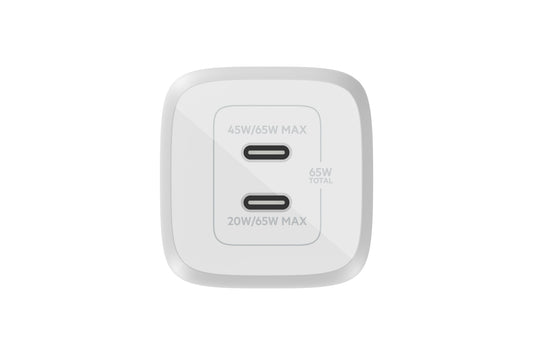 Belkin 65W GaN Dual USB C PD 3.0 Fast Charger with PPS Technology, Compact Size, USB-C, Type C Fast Charger for iPhone, MacBook Air, iPad Pro, Pixel, Galaxy, More Devices – White