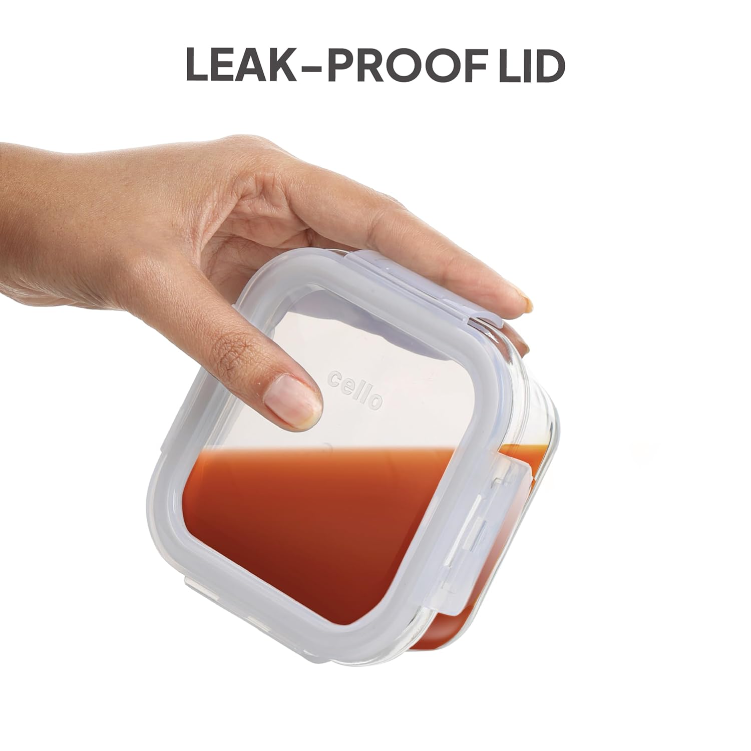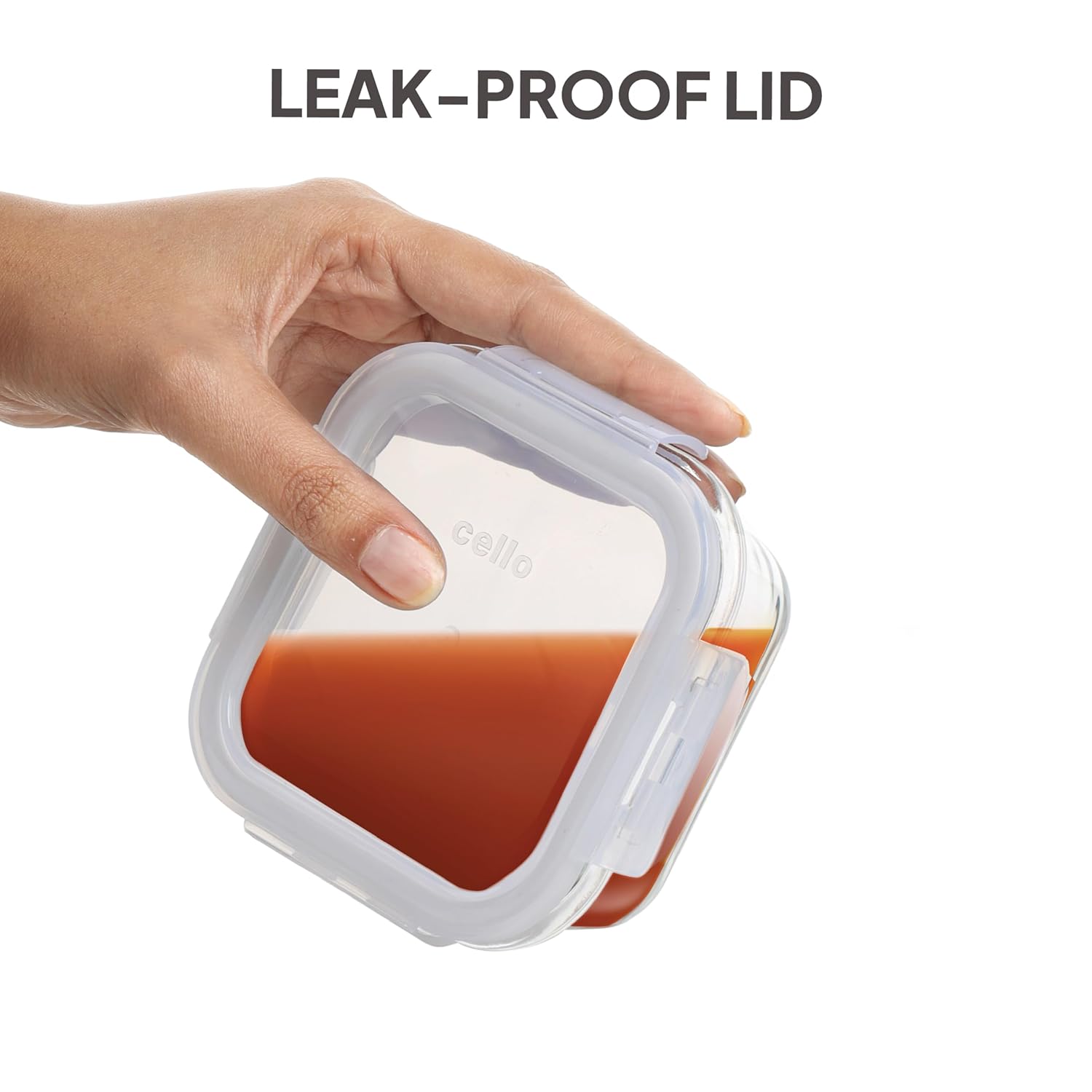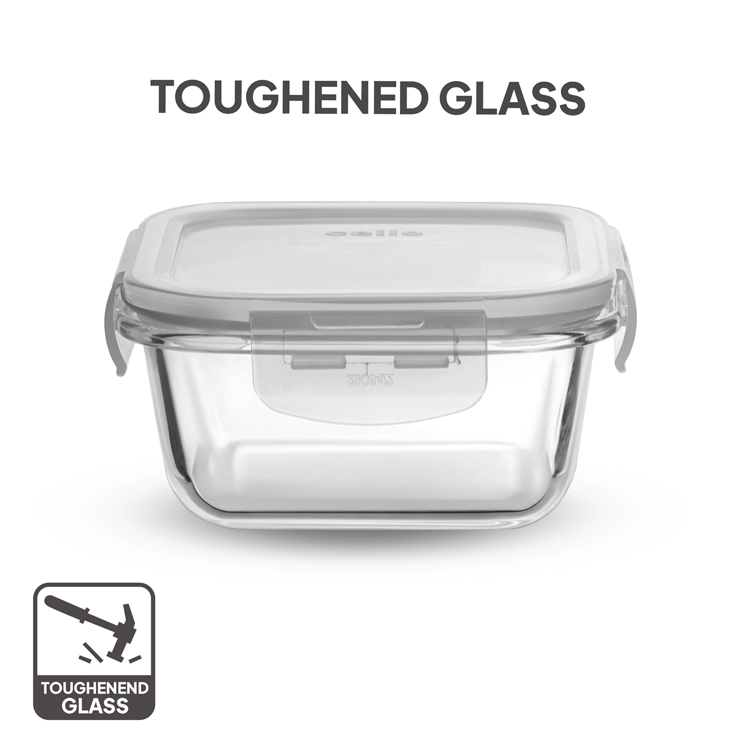 CELLO Glassy Square Lunch Box Set of 2 (320 ml x 2), Clear | Microwavable Toughened Glass | Leak Proof Design | Tiffin for Office/School/College