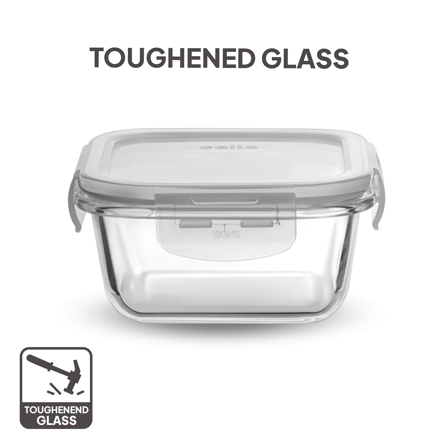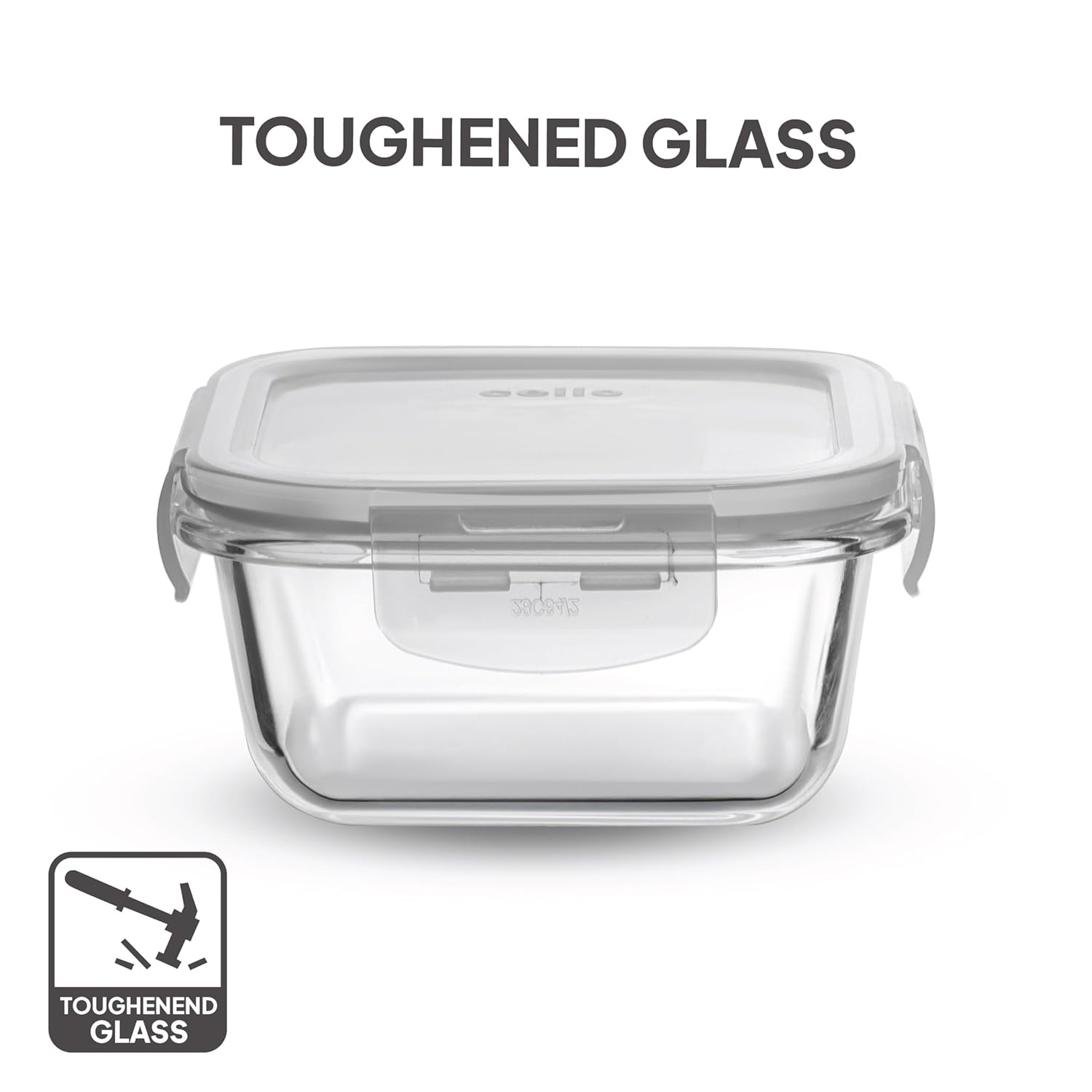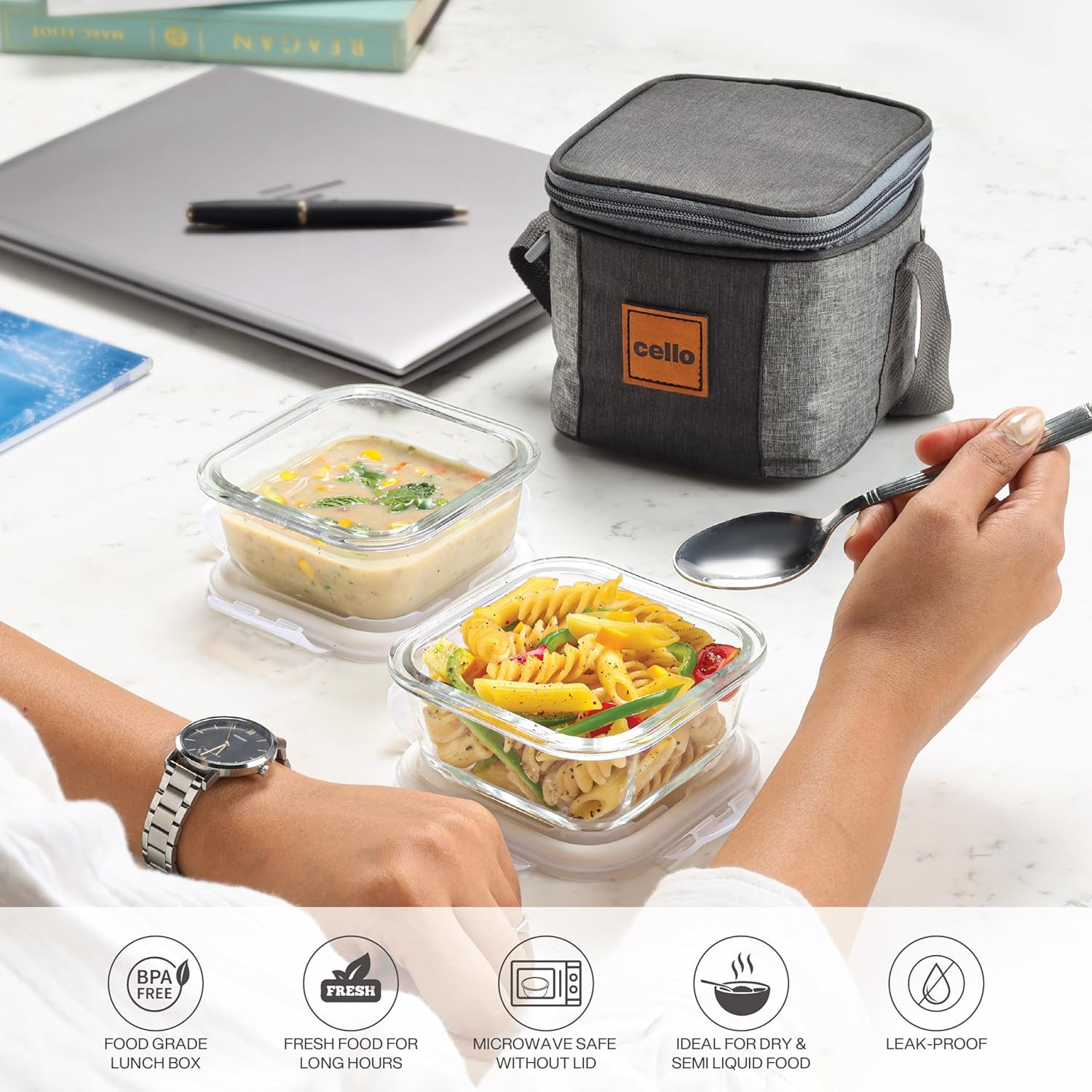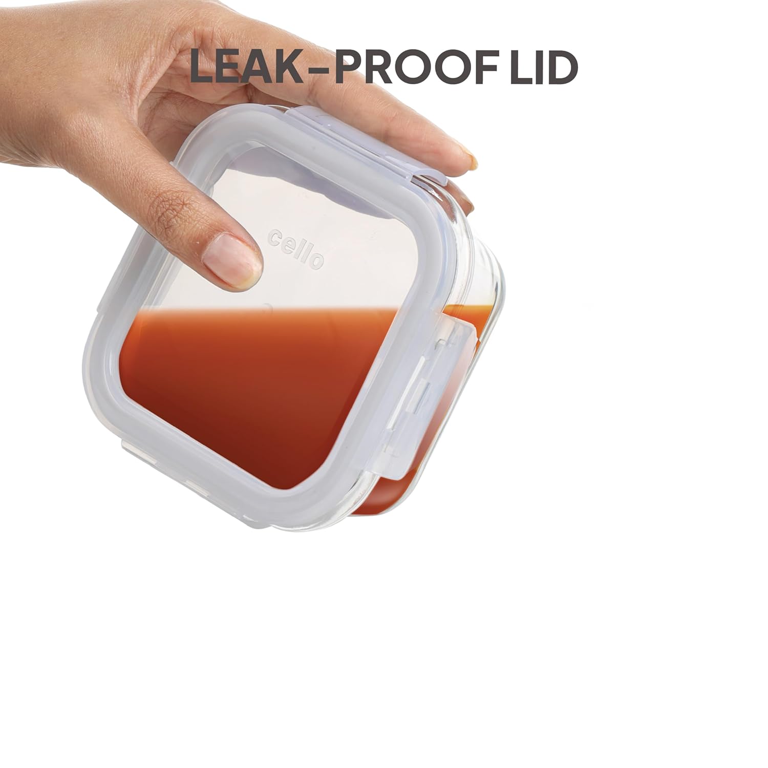 CELLO Glassy Square Lunch Box Set of 2 (320 ml x 2), Clear | Microwavable Toughened Glass | Leak Proof Design | Tiffin for Office/School/College