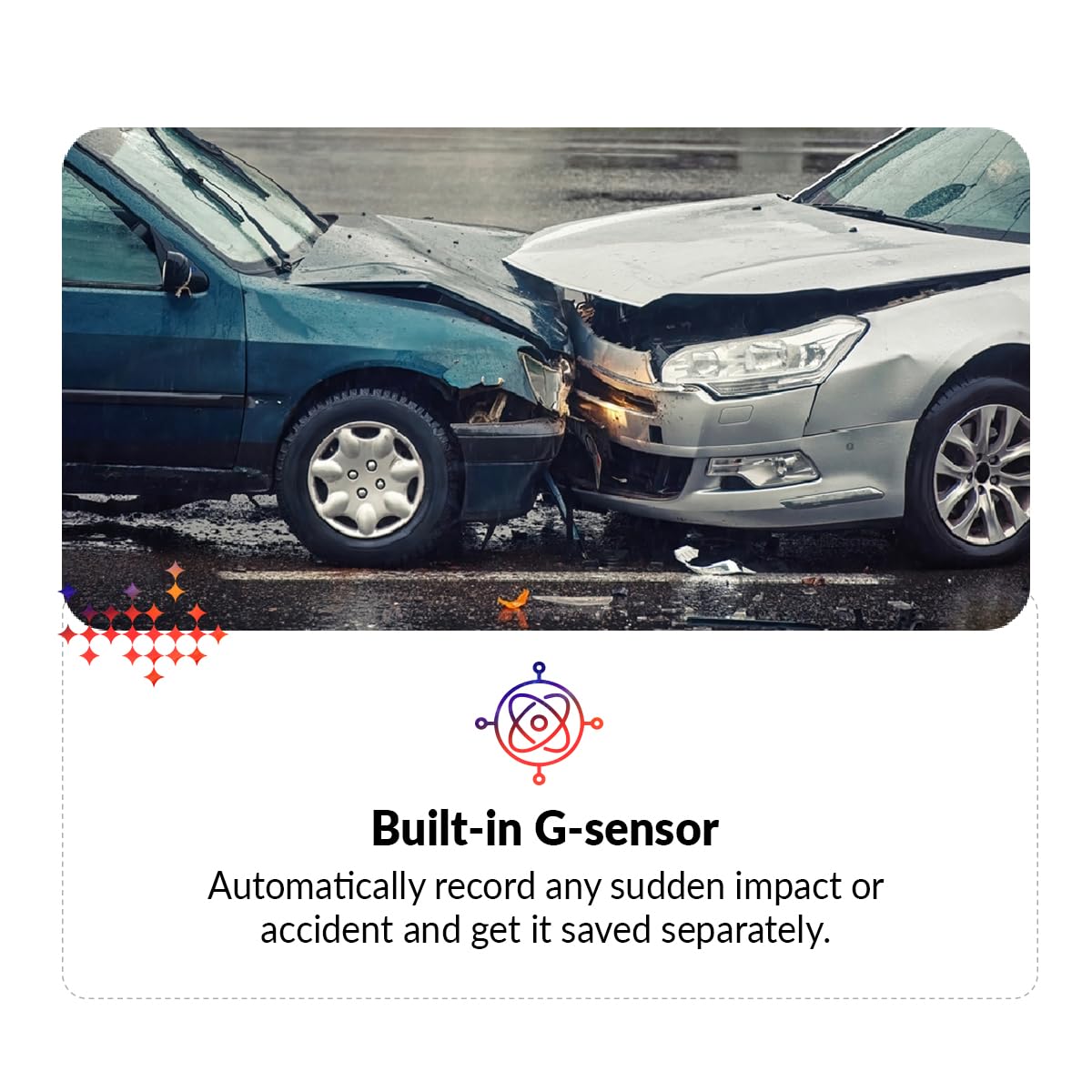 - Built-in G-sensor: Triggered by sudden changes in acceleration, deceleration, or impacts. When the CarKam detects a signicant impact, it automatically saves the recorded footage in a secure folder, securing it from loop-recording.